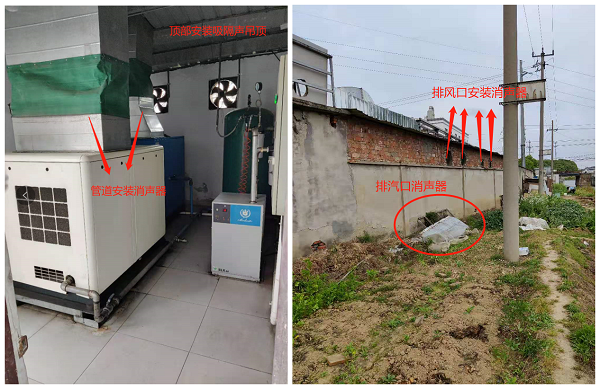 (3)空壓機房隔聲加強。空壓機噪聲較高且靠近廠界,機房頂部為單層彩鋼板,隔聲量不足,需要進行隔聲加強,空壓機房靠近廠界側有4套排風扇,存在漏聲,空壓機散熱口風管為單層鐵板,均需要加裝消聲器,底部排汽口加裝消聲器。