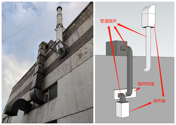 根據現場實測數據、噪聲情況分析和設計依據及治理目標,結合經濟性、可靠性和實用性,設計此降噪方案: